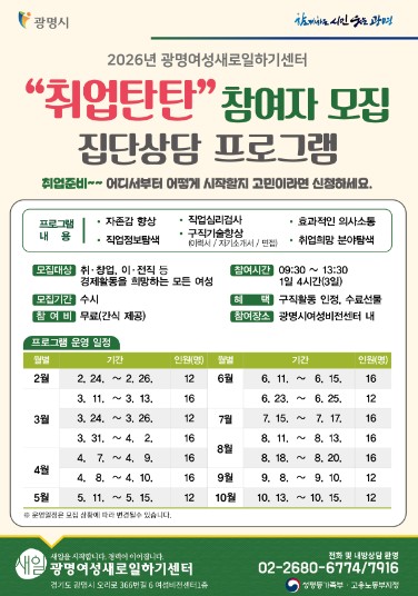 광명여성새로일하기센터는 취·창업과 이·전직을 희망하는 여성을 위해 ‘취업탄탄’ 집단상담 프로그램 참여자를 수시 모집하고 있다고 8일 밝혔다.
