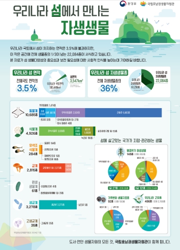 현재 우리나라 섬 면적은 3,547km2로 국토의 약 3.5%에 불과하지만, 이 공간에 서식하는 생물은 전체 자생생물 61,230종 중 36%를 차지해, 섬이 생물다양성의 보고이자 핵심 연구 대상지임을 보여준다.