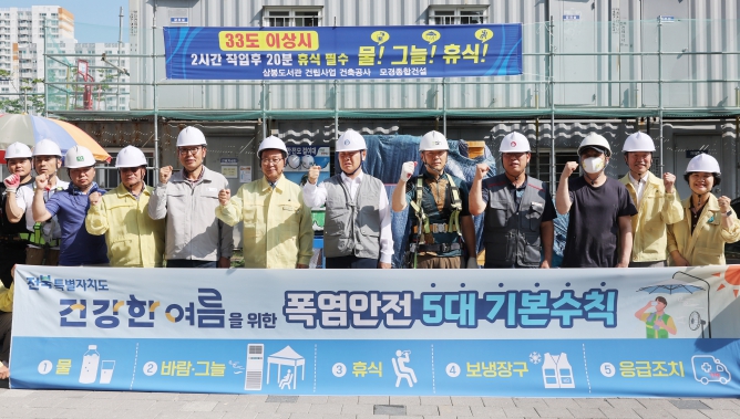 건설현장에서 김 지사는 “무더위에는 무엇보다 근로자의 건강과 안전이 최우선”이라며 “특히 오후 2시부터 5시까지 가장 더운 시간대에는 야외 작업을 중단하고, 물‧그늘‧휴식을 철저히 보장해 달라”고 당부했다. 이어 “작은 배려가 생명을 지킨다”며 폭염 대응 기본수칙의 철저한 이행을 강조했다.