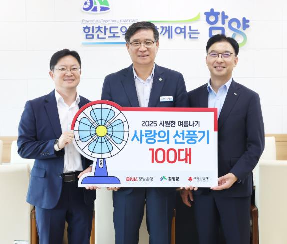 [파이낸셜경제=김예빈 기자] 함양군은 21일 비엔케이(BNK) 경남은행 함양지점에서 함양군청을 방문해 취약계층에 전달해 달라며 선풍기 100대(약 300만 원 상당)를 기부했다고 밝혔다.