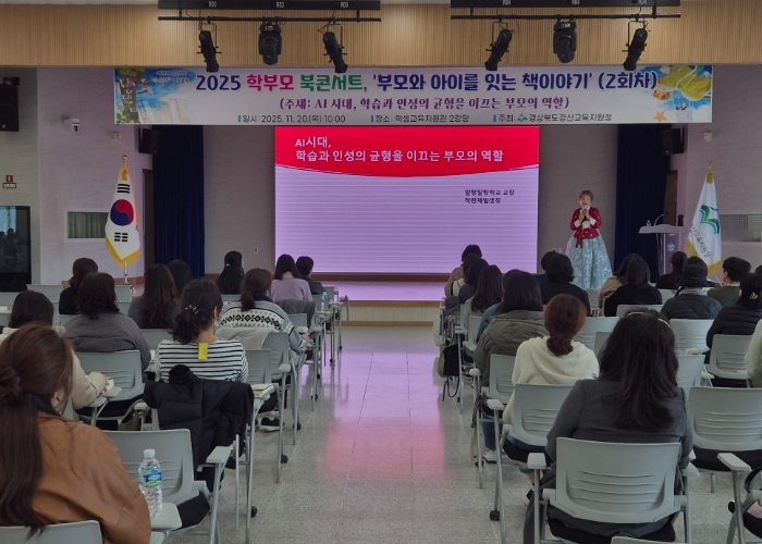 [파이낸셜경제=김지훈 기자] 경상북도경산교육지원청은 11월 20일 학생교육지원관 강당에서 개최한 ‘2025 부모와 아이를 잇는 책 이야기’ 북콘서트 행사를 성황리에 마무리했다고 21일 밝혔다. 경산 관내 유·초·중·고 학부모 약 80여 명이 참석하여 미래 교육에 대한 높은 관심을 보였다.