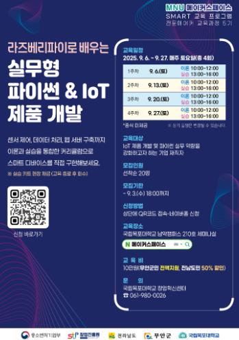 [파이낸셜경제=김예빈 기자] 전남 무안군은 국립목포대학교 창업혁신센터 MNU메이커스페이스에서 9월 27일까지 ‘라즈베리파이로 배우는 실무형 파이썬&IoT’를 운영한다고 밝혔다.