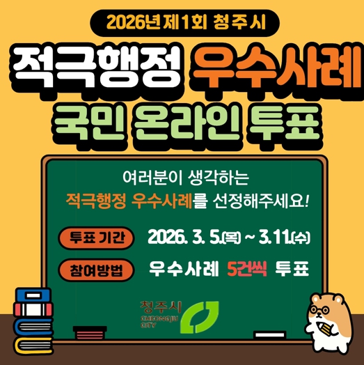 [파이낸셜경제=김기보 기자] 청주시는 ‘2026년 제1회 적극행정 우수공무원 선발’ 공모 심사를 위한 시민 투표를 3월 11일까지 진행한다고 7일 밝혔다.