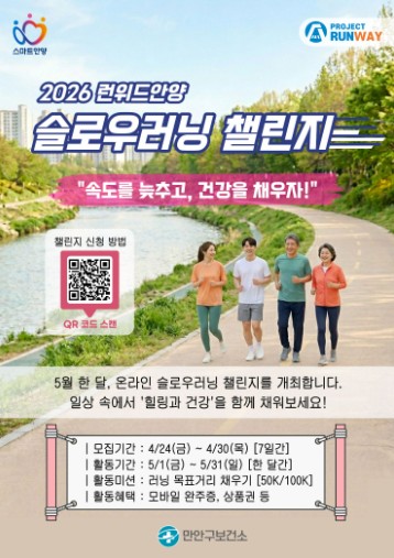 [파이낸셜경제=김기보 기자] 안양시는 시민들의 일상 속 신체활동을 독려하고 건강한 운동 습관 형성을 돕기 위해 오는 5월 한 달간 ‘2026 런위드안양 슬로우러닝 챌린지’를 개최한다고 23일 밝혔다. 참가자 모집은 이달 24일부터 30일까지 진행된다.