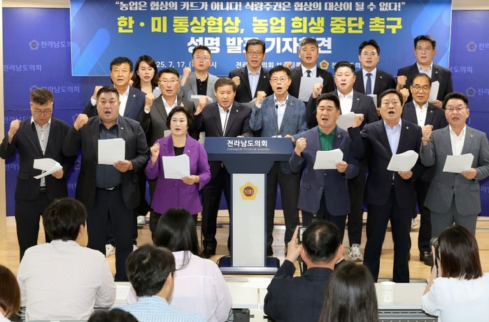 [파이낸셜경제=김예빈 기자] 전라남도의회는 7월 17일, 브리핑룸에서 최근 한미 통상협상과 관련하여 농업 분야가 다시금 협상의 희생양이 되는 것을 강력히 반대하며, 향후 통상협상 과정에서 우리 농업을 굳건히 지킬 것을 촉구하는 성명서를 발표했다.