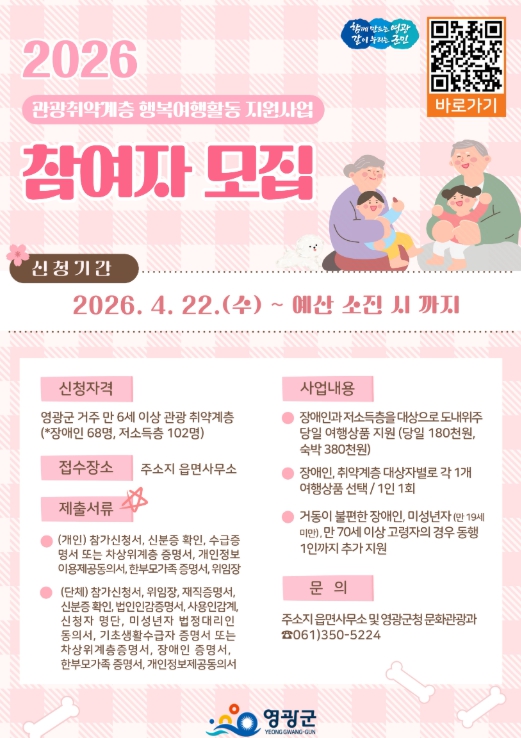 [파이낸셜경제=김예빈 기자] 영광군은 지난 4월 22일부터 관광활동에서 소외되기 쉬운 관광취약계층의 기본권 보장을 위해‘2026년 관광 취약계층 행복여행활동 지원사업’참가자를 모집하고 있다고 밝혔다.