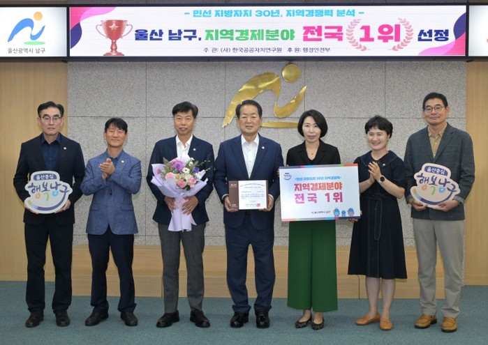 [파이낸셜경제=김예빈 기자] 울산 남구는 행정안전부가 후원하고 (사)한국공공자치연구원(KPA)(원장 이기헌) 주관으로 진행된‘민선 지방자치 30년, 지역경쟁력 향상 평가’에서 ‘지역경제 부문 전국 1위’를 기록해 최우수기관으로 인증받고 전국 '최고 수준'의 지방자치 경쟁력을 입증했다.