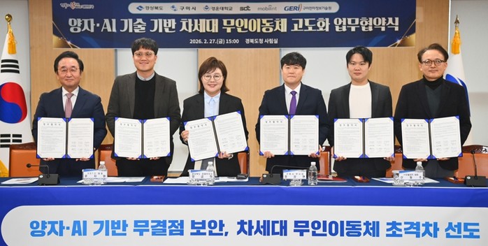 경상북도는 2월 27일 경북도청 회의실에서 양금희 경상북도 경제부지사, 정성현 구미시 부시장을 비롯해 윤지원 SDT(주) 대표, 신동주 ㈜모빌린트 대표, 최호성 경운대학교 부총장, 문추연 구미전자정보기술원 원장이 참석한 가운데 '양자·AI 기술 기반 차세대 무인이동체 고도화를 위한 업무협약(MOU)'을 체결했다고 밝혔다.
