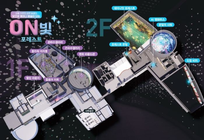 관람객들은 ▲ 콜라주 기법과 명화를 활용한 파노라마형‘명화 라운드관’▲ 움직이는 빛과 생명체를 따라 숲속을 탐험하는 듯한 몰입 경험을 주는‘데이나잇 포레스트관’▲ 빛의 입자들이 모여 거대한 우주의 풍경을 그려내는‘온빛의 샤워관’등 10개 주제관에서 오감을 자극하는 몰입형 전시를 즐길 수 있으며 아이들이 모래놀이를 즐길 수 있는‘온빛 아트플레이관’도 마련되어 가족단위 방문객에게 큰 호응을 얻을 것으로 기대 된다.