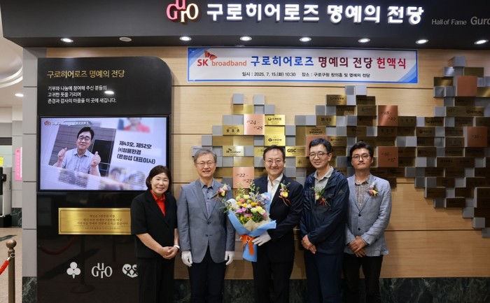 이날 장 구청장은 구청 창의홀에서 SK브로드밴드(주) 김지훈 경영전략실장에게 사회공헌 인증서를 전달하고 본관 1층 명예의 전당에 제78호 구로히어로즈 명패를 등재했다.