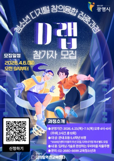 [파이낸셜경제=김기보 기자] 광명시 디지털혁신교육센터가 지역 청소년들의 디지털 창의성과 인공지능(AI) 역량을 강화하기 위한 장기 교육 과정인 ‘2026 청소년 디지털 창의융합 집중과정 디(D)랩’ 참가자를 모집한다.