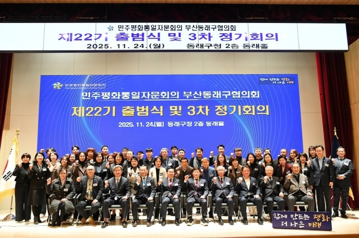 [파이낸셜경제=박영진 기자] 부산 동래구는 지난 11월 24일 민주평화통일자문회의 부산동래구협의회(협의회장 추한권)가 동래구청 동래홀에서 장준용 구청장, 자문위원 등 90명이 참석한 가운데 ‘제22기 출범식 및 2025년 3차 정기회의’를 개최했다고 밝혔다.