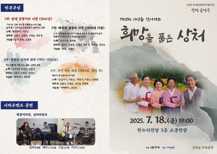 서용우 연출, 전영훈 음악감독, 이은신 프로듀서가 제작한 이번 창작 음악극 ‘희망을 품은 상처'는 2025년 무대공연 제작 지원사업으로 관람료는 전석 무료이다.