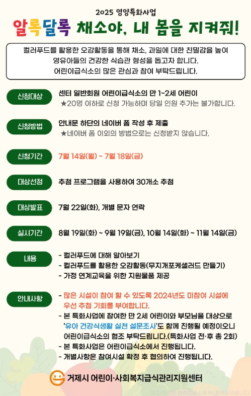 [파이낸셜경제=김예빈 기자] 거제시 어린이·사회복지급식관리지원센터(센터장 황경순)는 지난해 높은 호응을 얻은 영양 특화사업 ‘알록달록 채소야, 내 몸을 지켜줘!’를 올해 확대 운영한다고 밝혔다.