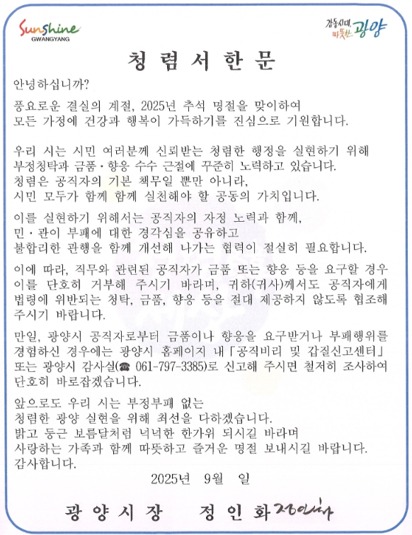 [파이낸셜경제=김예빈 기자] 광양시가 9월 24일 추석 명절을 앞두고 외부 민원인과 내부 직원들에게 청렴서한문을 발송해 청렴한 공직문화와 건전한 명절 분위기 조성에 앞장섰다.
