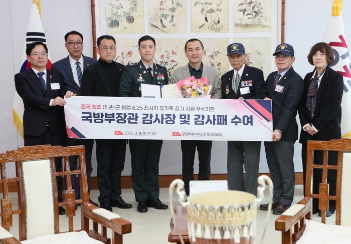 [파이낸셜경제=조성환 기자] 강원특별자치도는 국방부 유해발굴감식단이 추진한 ‘2025년 민·관·군 협업 6·25전사자 유가족 집중 찾기’ 사업에서 전국 최초 민관군 협업 6.25전사자 유가족 찾기 지원 우수기관으로 선정돼, 3월 9일 국방부장관으로부터 감사장과 감사패를 수상했다고 밝혔다.