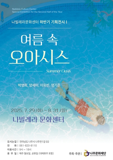 [파이낸셜경제=김예빈 기자] 나주문화재단이 오는 7월 29일부터 8월 31일까지 나빌레라문화센터에서 하반기 첫 번째 기획전시 ‘여름 속 오아시스’를 개최하고 무더운 여름철 시민들에게 감각적 예술과 함께하는 특별한 휴식을 선사한다.