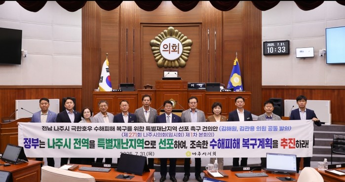 건의안을 김관용 의원과 공동 발의한 김해원 의원은 “이번 호우 피해는 지역 차원에서 감당할 수 없는 사회·경제적 재난”이라며, “정부는 나주시 전역을 특별재난지역으로 신속히 선포하고 현실적인 복구 및 재정지원이 이루어져야 한다”고 밝혔다.