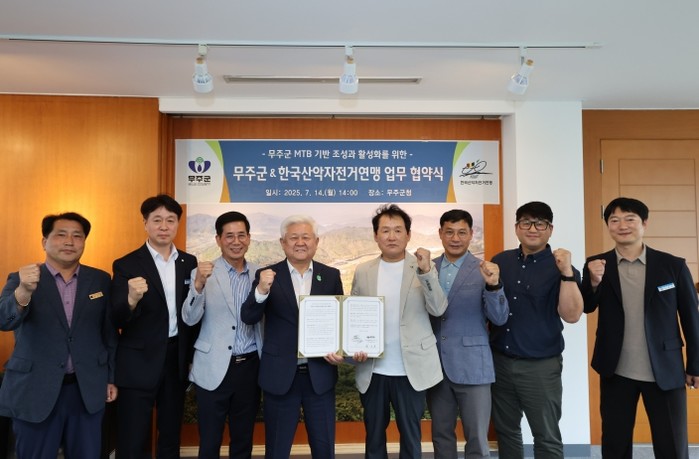 이날 무주군청에서 열린 협약식에는 황인홍 무주군수와 김제권 한국산악자전거연맹 회장을 비롯한 양측 관계자 등 10여 명이 참석해 △무주군의 MTB 인프라 조성 및 활성화를 위한 컨설팅 지원, △MTB 저변 확대 및 스포츠관광 활성화를 위한 공동 과제 발굴, △각 기관의 홍보 채널을 활용한 홍보 다각화 등을 약속했다.