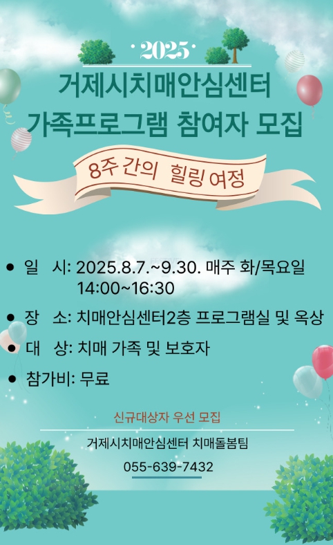 현재 가족 수업 대상자를 모집 중이며 관심 있는 치매 환자 가족들은 거제시치매안심센터로 문의하면 상세하게 상담받을 수 있다.