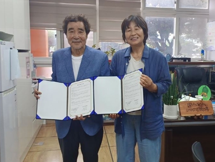 | ▲ 왼쪽부터 사단법인 정용근 김해오광대보존회 부회장, 박미홍 김해구봉초등학교장 |