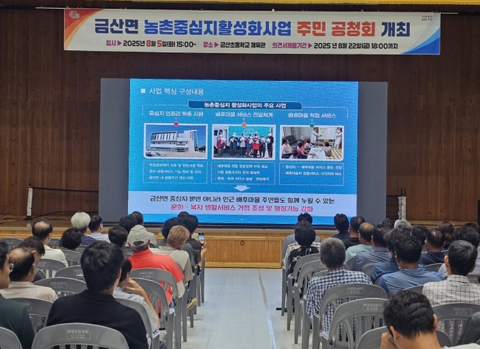 이날 공청회에는 시의원, 지역주민, 지역단체 등이 참석한 가운데 ‘금산면 농촌중심지 활성화사업’에 대한 설명회와 주민 의견을 청취하는 자리로 행정복합문화센터 조성에 대한 다양한 의견이 수렴됐다.