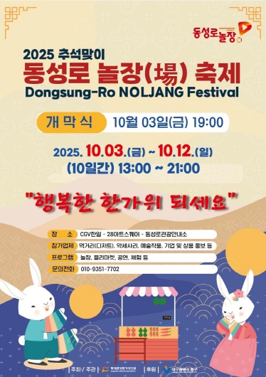 [파이낸셜경제=김지훈 기자] 대구 중구는 10월 3일부터 12일까지 10일간 동성로 보행자전용도로 일원에서 ‘동성로에서 놀며 장보자!’라는 테마로 ‘2025 추석맞이 동성로 놀장(場) 축제’를 개최한다.