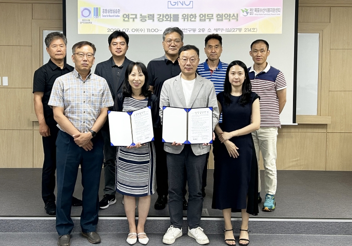 | ▲ 경상국립대학교(GNU) 공동실험실습관 및 첨단소재분석지원센터(관장 및 센터장 고필옥 수의학과 교수·앞줄 왼쪽)와 (재)목포수산식품지원센터(센터장 윤영승)는 7월 9일 오전 공동실험실습관에서 공동연구 업무협약(MOU)을 체결했다. |