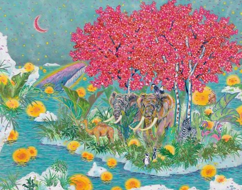 | ▲ 윤우제 작, 기어이 자작나무는 분홍 꽃을 틔워냈고 그들의 여행 같은 표류는 시작되었다. (116x91, 장지에 수간안료, 2025) |