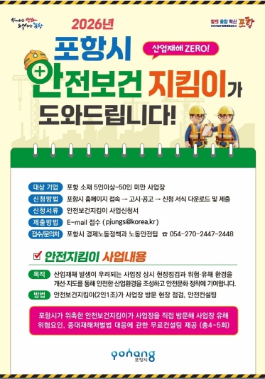 [파이낸셜경제=김지훈 기자] 포항시는 지역 소규모 사업장의 산업재해를 예방하고 자율적인 안전관리 체계를 구축하기 위해 ‘2026년 안전보건지킴이 지원사업’ 참여 사업장을 모집한다.