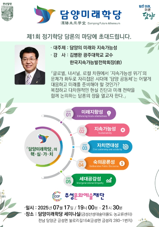 [파이낸셜경제=김예빈 기자] 추성문화예술재단은 오는 7월 17일 저녁 7시, 전남 담양군 금성면 금성산성대숲마을도·농교류센터(담양미래학당 세미나실)에서 ‘담양의 미래와 지속가능성’을 주제로 제1회 담양미래학당 정기학당을 개최한다.