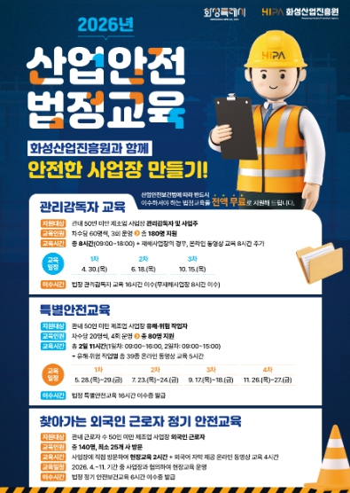 [파이낸셜경제=김기보 기자] 화성산업진흥원은 관내 제조업 사업장의 산업재해 예방과 안전관리 역량 강화를 위해 ‘2026년 산업안전 법정교육 지원사업’을 추진한다.