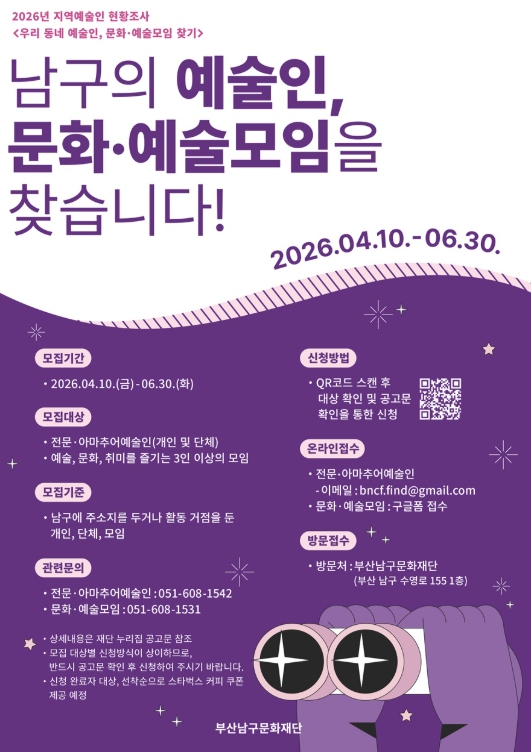 조사는 4월 10일부터 6월 30일까지 진행되며, 자세한 내용은 부산남구문화재단 누리집 공고문에서 확인할 수 있다.