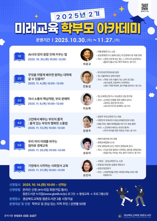 [파이낸셜경제=김지훈 기자] 경상북도교육청 점촌도서관은 10월 30일부터 11월 27일까지 학부모 및 일반인을 대상으로 2025년 2기'미래교육 학부모 아카데미'를 운영한다.