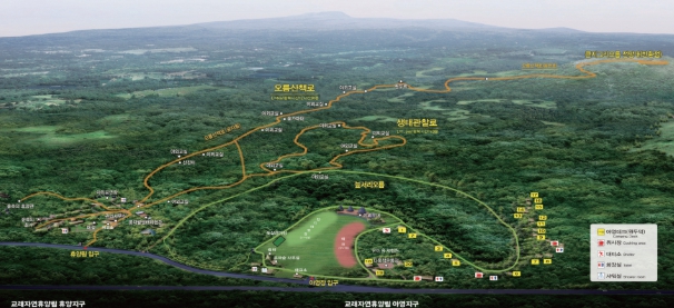 곶자왈의 희귀 식생과 지형을 조망하는 생태관찰로(1.5㎞), 완만한 경사로 다양한 생태를 감상하기 좋은 큰지그리오름이 있는 오름산책로(4㎞), 야영장 둘레를 산책하는 늪서리오름 산책로(2㎞)다. 탐방 시간은 코스에 따라 40분에서 3시간 정도 소요된다.
