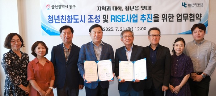 [파이낸셜경제=김예빈 기자] 울산 동구는 7월 21일 낮 12시 울산과학대학교(총장 조홍래)와 ‘청년친화도시 조성 및 RISE사업 추진을 위한 업무협약’을 체결했다. 협약식에는 김종훈 동구청장과 울산과학대 조홍래 총장, 대학 관계자 등이 참석했다.