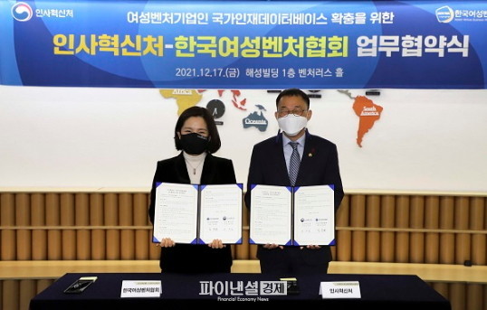 인사혁신처와 한국여성벤처협회는 17일 서울 역삼동에서 ‘여성 벤처기업인의 국가인재데이터베이스 확충 및 활용을 위한 업무협약(MOU)’을 체결했다고 밝혔다.