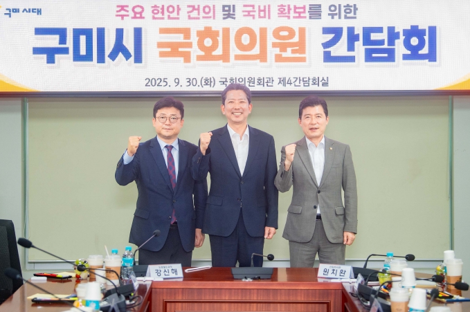 [파이낸셜경제=김지훈 기자] 구미시는 9월 30일 국회를 방문해 구자근, 강명구 지역구 국회의원과 간담회를 열고 지역 주요 현안과 국비 확보 전략을 논의했다. 이날 간담회에는 김장호 시장을 비롯해 구미시 주요 간부 공무원 등 30여 명이 참석했다. 시는 현안 사업 추진 상황과 정부 예산 동향을 공유하며 국회 차원의 전략적 지원 방안을 모색했다.