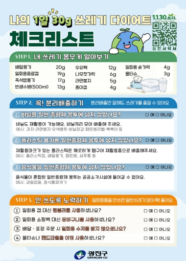 광진구가 구민과 함께하는 생활폐기물 감량 실천운동 ‘1.1.30.쓰다(쓰레기 다이어트)’ 확산을 위해 일일 체크리스트를 제작·배부한다.