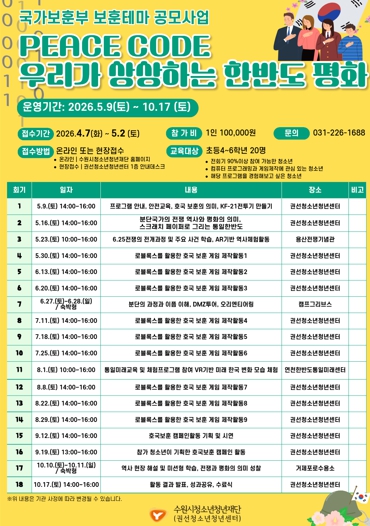 [파이낸셜경제=김기보 기자] 수원시청소년청년재단 권선청소년청년센터는 디지털 기술과 호국보훈 역사를 결합한 이색 프로젝트 ‘PEACE CODE : 우리가 상상하는 한반도 평화’의 참가 청소년을 모집한다.