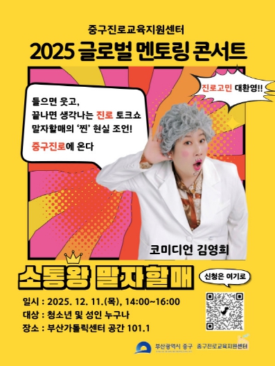 [파이낸셜경제=박영진 기자] 부산 중구는 오는 11일 오후 2시 부산가톨릭센터 공간 101.1에서 ‘2025 글로벌멘토링 콘서트’가 개최한다고 밝혔다.
