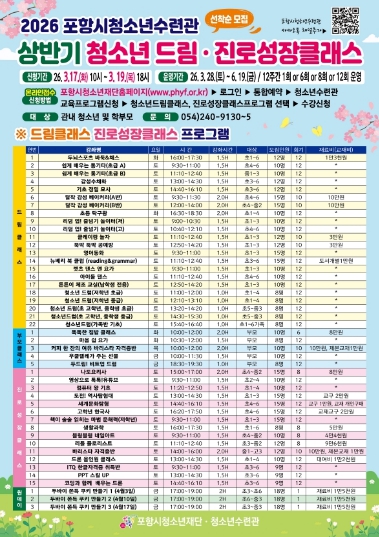 [파이낸셜경제=김지훈 기자] 포항시청소년재단 청소년수련관은 청소년들의 흥미와 적성을 발견하고 진로 역량을 강화하기 위한 ‘2026년 상반기 청소년 드림·진로성장 클래스’ 수강생을 모집한다.