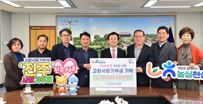 [파이낸셜경제=김예빈 기자] 진주시는 3일 시청 기업인의 방에서 산청군농협 임직원 80여 명이 동참한 고향사랑기부금 800만 원을 기탁받았다고 전했다.