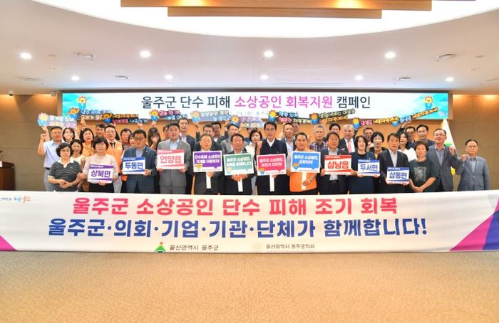 | ▲ 울산 울주군이 29일 군청 문수홀에서 이순걸 군수와 울주군의회 최길영 의장 및 군의원, 소상공인연합회, 외식업지부, 관내 기업 관계자 및 지역 사회단체장 등 40여명이 참석한 가운데 ‘단수 피해 소상공인 회복지원 캠페인’을 개최했다. |