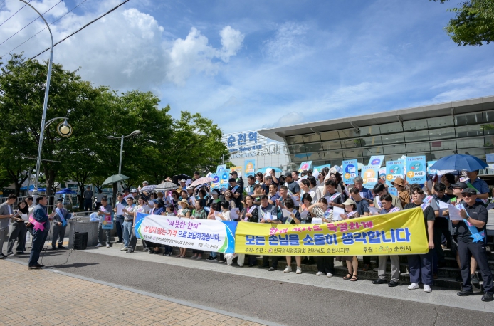[파이낸셜경제=김예빈 기자] 한국외식업중앙회순천시지부(회장 박용남)는 13일 휴가철을 맞아 순천시외식업위생단체 및 종사자, 시민 등 200여 명과 함께 순천역 광장에서 관광객 맞이 ‘외식업소 친절 서비스 실천 결의 캠페인’을 전개했다고 밝혔다.