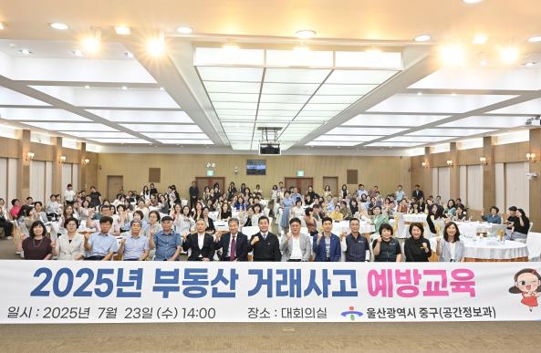 [파이낸셜경제=김예빈 기자] 울산 중구가 7월 23일 오후 2시 중구청 대회의실에서 지역 내 개업·소속 공인중개사 150여 명을 대상으로 ‘2025년 부동산 거래사고 예방 교육’을 진행했다.