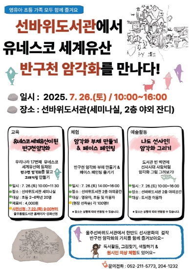 [파이낸셜경제=김예빈 기자] 울주선바위도서관이 오는 26일 유네스코 세계유산 ‘반구천 암각화’의 가치를 재조명하고 알리는 어린이 문화체험행사를 개최한다고 20일 밝혔다.