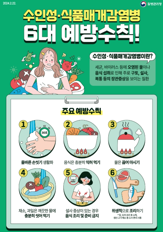 수인성·식품 매개 감염병 예방 수칙으로는 ▲흐르는 물에 30초 이상 비누로 손 씻기 ▲안전한 물(포장된 생수나 끓인 물)과 음식은 충분히 익혀 먹기(85℃ 이상에서 1분 이상 가열) ▲위생적으로 조리하기(칼·도마는 소독하여 사용, 생선·고기·채소별로 도마 분리 사용 등) ▲손에 상처가 있는 경우 식재료 세척 등 조리 과정에 참여하지 않기 ▲오염된 물이 닿거나 일정 시간(약 4시간) 이상 냉장이 유지되지 않은 음식 폐기하기 ▲수해복구 등의 작업 시에는 방수 장갑(고무장갑) 등으로 피부 노출을 최소화하고, 작업 종료 후 깨끗이 씻기 등이 있다.
