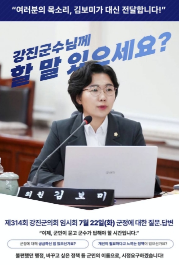 [파이낸셜경제=김예빈 기자] 김보미 강진군의회 의원은 22일 열린 제314회 임시회 군정질문에서 강진원 군수와 일문일답 형식의 질의를 통해, 특정 외지업체에 집중된 협상계약 실태와 불투명한 계약정보공개시스템 운영의 문제점을 조목조목 지적하며, 공정한 계약체계 마련을 통한 지역경제 회복을 강도 높게 촉구했다.