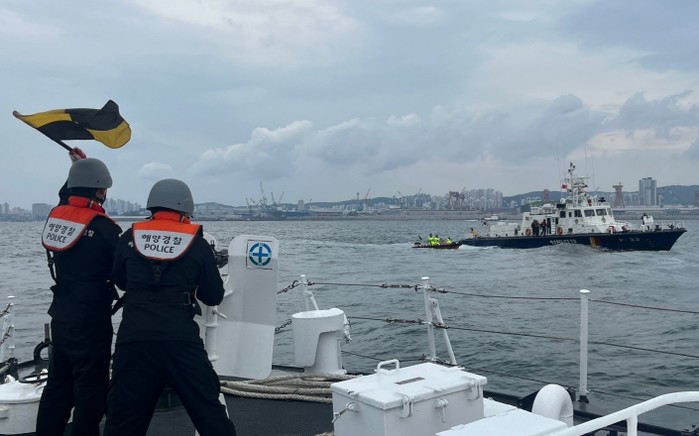[파이낸셜경제=김예빈 기자] 울산해양경찰서는 16일 우리나라의 특수함정을 건조하는 HD현대중공업의 해·육상 테러 상황에 대비하기 위한 항만방호·대테러 훈련을 실시했다.